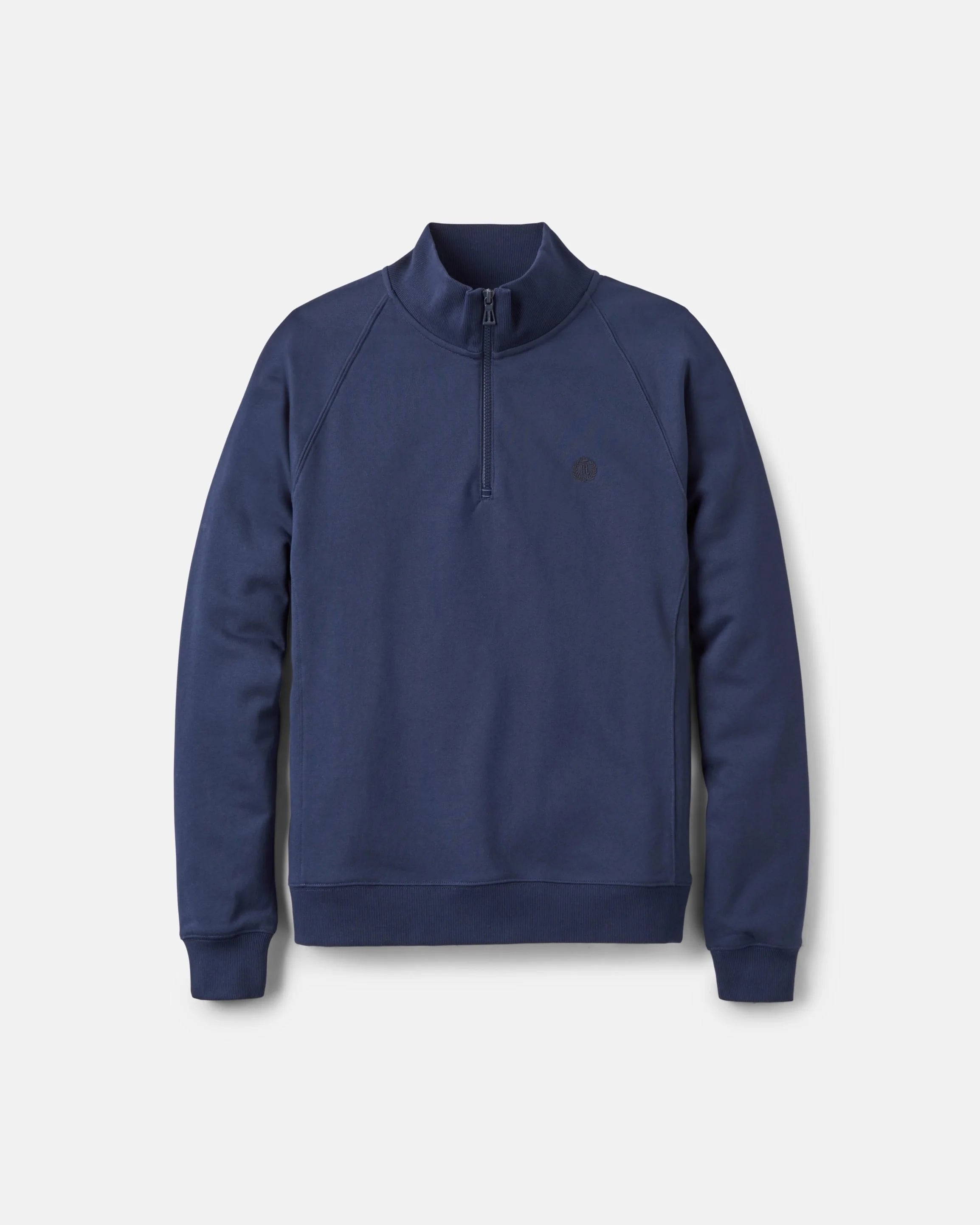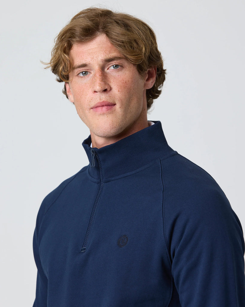 Crafted from heavyweight 315gsm brushback sweat fabric, this Navy sweatshirt offers both warmth and refined style. Featuring a ribbed collar and cuffs, a smooth YKK quarter zip, and a sleek raglan armhole design, it ensures comfort and ease of movement. Subtle Laurel and Crown embroidery at the chest adds a touch of understated elegance, making it an ideal piece for layering or wearing on its own in cooler weather.