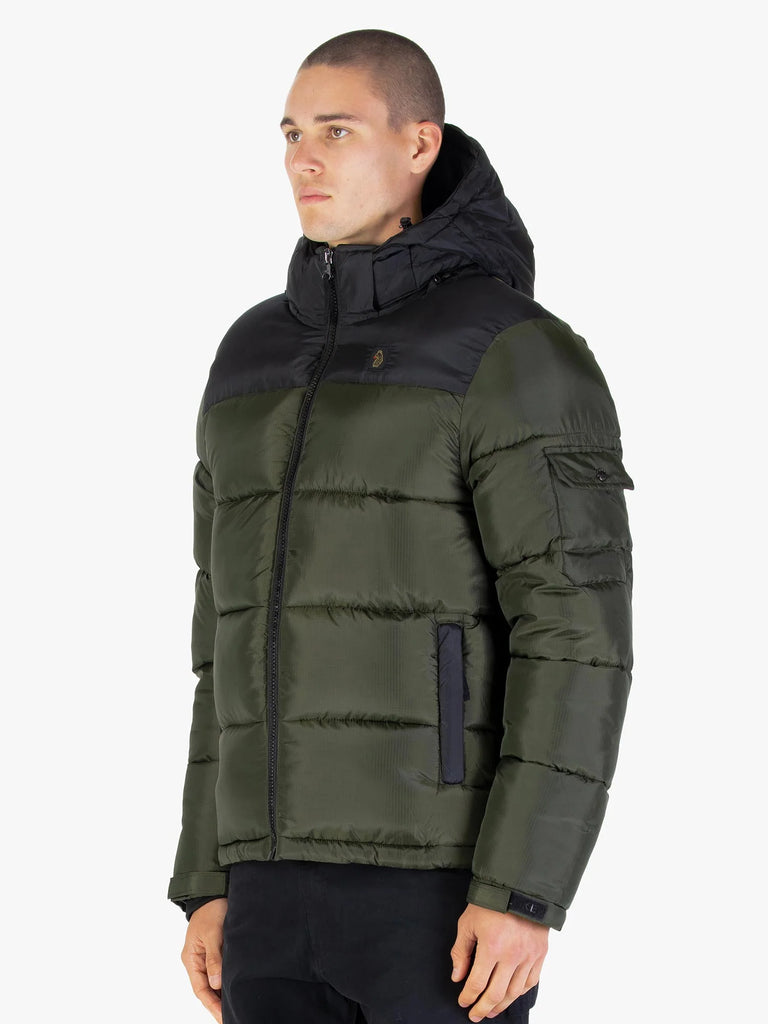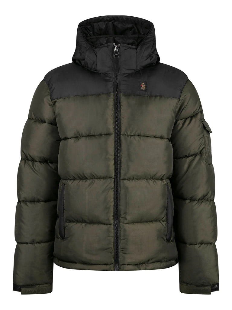 This Luke 1977 M680717 Yupick Hooded Jacket in dark green combines functionality with refined style. Crafted with recycled wadding, it ensures warmth while remaining eco-conscious. The detachable hood and ribbed cuffs provide adaptable comfort, perfect for chilly outdoor events. Featuring dark pewter gloss zip pullers, secure front zip pockets, and a distinctive LUKE 1977 repeat print lining, this jacket subtly elevates your winter wardrobe. Finished with the iconic lion head woven badge on the chest, it embodies understated sophistication for the modern man.