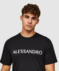 Embrace the power of simplicity with this sleek black cotton tee. Designed for comfort, it features a ribbed crew neck that offers flexible wear, a clean straight hem, and a striking Alessandro logo boldly displayed on the chest. Its regular fit and short sleeves make it an essential addition to elevate your wardrobe.