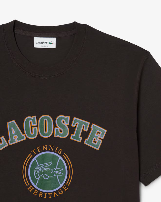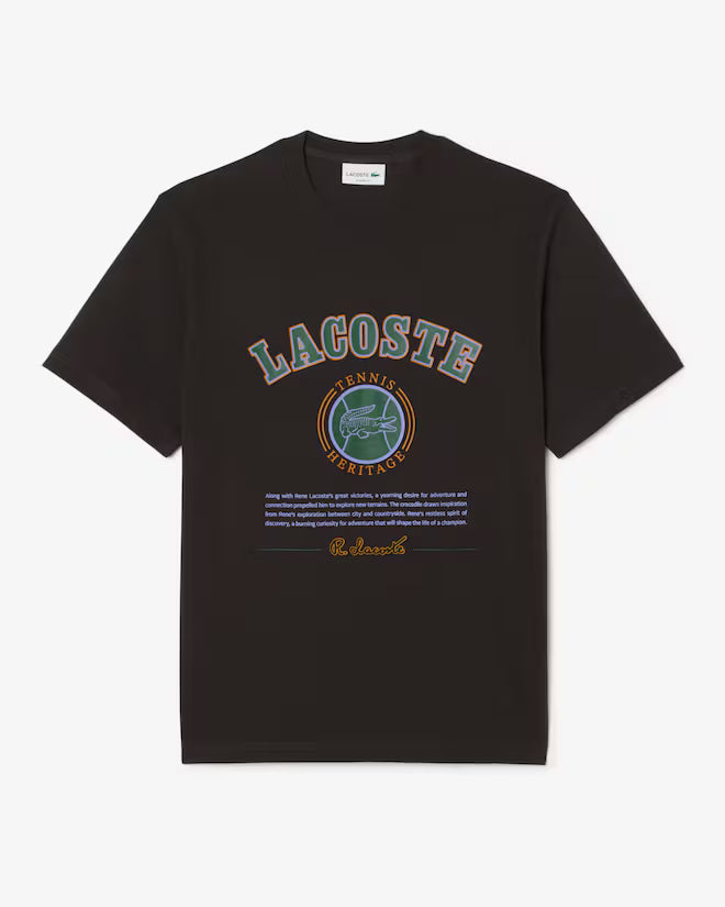 This T-shirt honors Lacoste’s legacy in French sportswear, crafted from midweight cotton jersey for effortless comfort. It features a striking large front print for a vibrant look, complemented by an embroidered crocodile on the back, adding a refined and genuine detail.