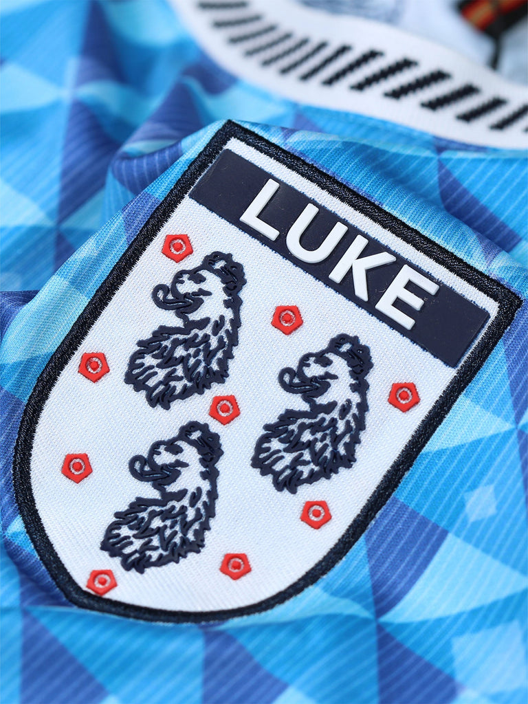 Left chest rubber badge Luke England football badge logo with Tears 90 flock print back logo