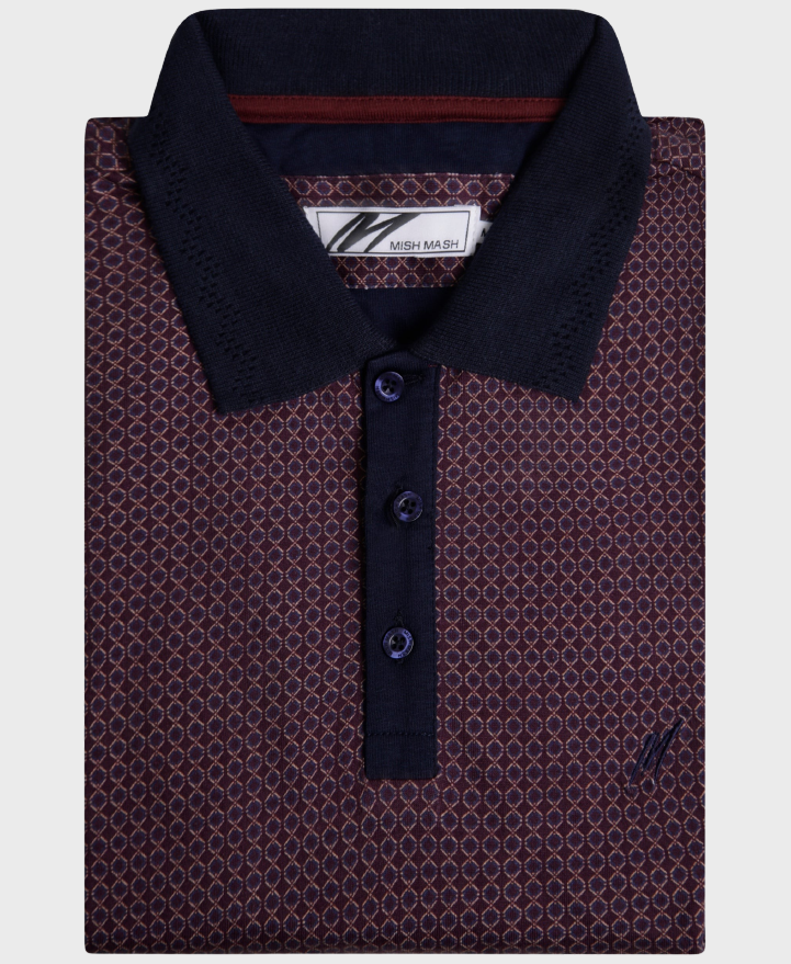 Elevate your style with the Mish Mash 2961 Sandbank Polo Shirt Wine. This smart short sleeve polo features a unique all over geo-metric print and a contrasting placket for added style. The 1x1 rib collar and cuff with jacquard tipping provide a comfortable fit. Made with 100% cotton and featuring branded details such as the chest embroidery and side tab label, this polo is a must-have for any wardrobe.