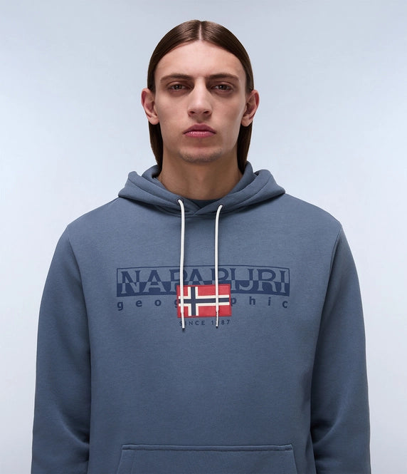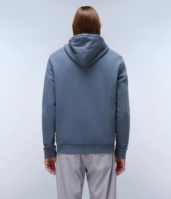 The Napapijri Aylmer hoodie combines Nordic heritage with everyday comfort. Crafted from pure cotton, this piece features a relaxed regular fit that moves with you, while the adjustable drawstring hood offers practical versatility. The iconic Norwegian flag graphic adds distinctive character to a wardrobe essential. Perfect for layering or wearing solo, the Stormy Weat colourway delivers understated sophistication that transcends seasonal trends.