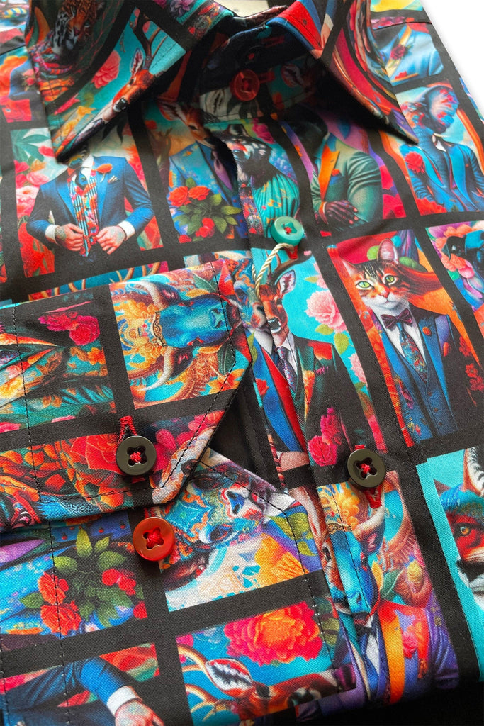 Make a statement with this striking Claudio Lugli shirt, featuring a captivating wildlife framed print against a sophisticated black base. Crafted from luxurious pure satin cotton, it delivers an elevated aesthetic with refined detailing throughout. Turkish-made excellence shines through bold trim accents and distinctive multi-coloured buttons, while the neat regular collar includes a concealed underside button for polished versatility. Adjustable cuffs ensure a tailored fit, making this piece an essential addition to any discerning gentleman's wardrobe.