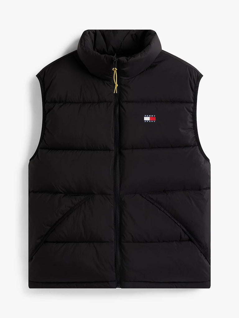 This Tommy Jeans Vail Relaxed Puffer Gilet in black combines refined style with practical design. Crafted from crinkle nylon with water-repellent properties, it offers reliable protection from the elements. The funnel neck and zip-through front provide comfortable coverage, while two angled front pockets and an interior snap-button pocket ensure secure storage. Subtle Tommy Jeans branding, including the repeat logo tape on pockets and a chest badge, adds a touch of signature sophistication to this versatile layering piece.