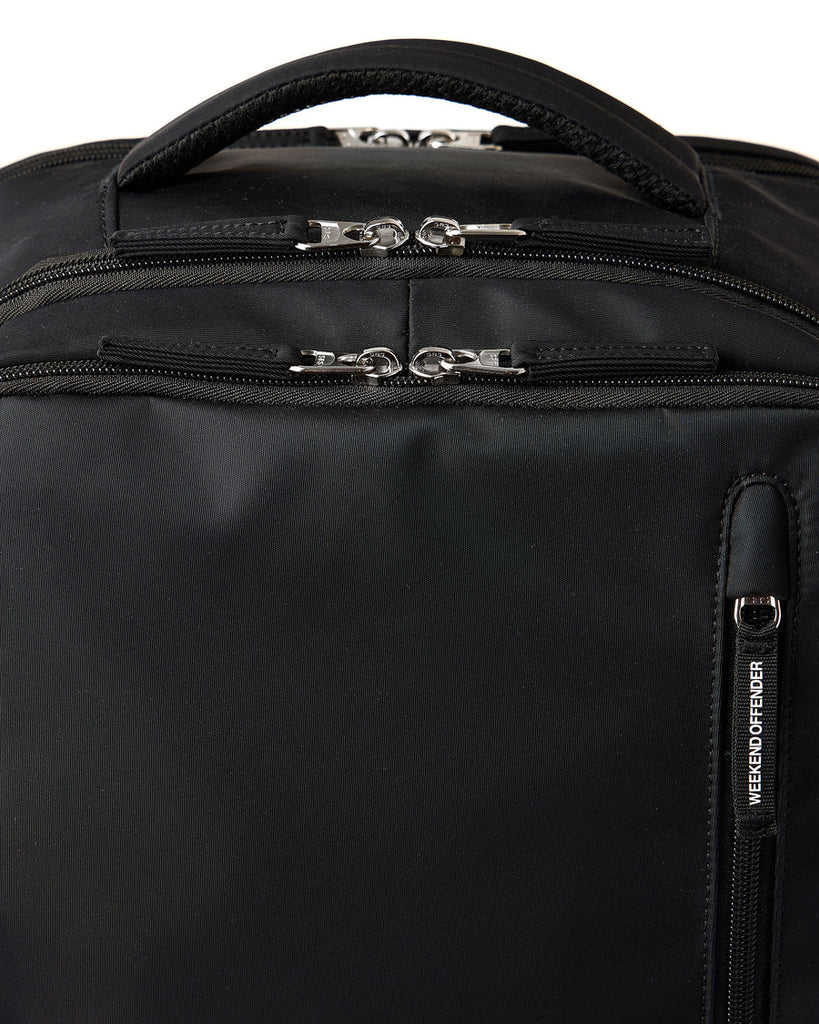 Master the art of airport travel with this slick Weekend Offender overnight bag. Built from durable high-density polyester, this 20L cabin-approved carry-on fits perfectly in overhead lockers or under your seat. Stay organised with multiple compartments including a cool-bag lined front section, anti-theft back pocket, and shoe storage at the base. The built-in USB charging port keeps your devices topped up on the go, while the external bottle pocket quenches your thirst mid-journey. Slip it over your suitcase handle for hands-free navigation, or wear it as a backpack with padded straps and chest strap. Thoughtful touches like branded zip pullers and a padded top handle make every trip feel effortless.