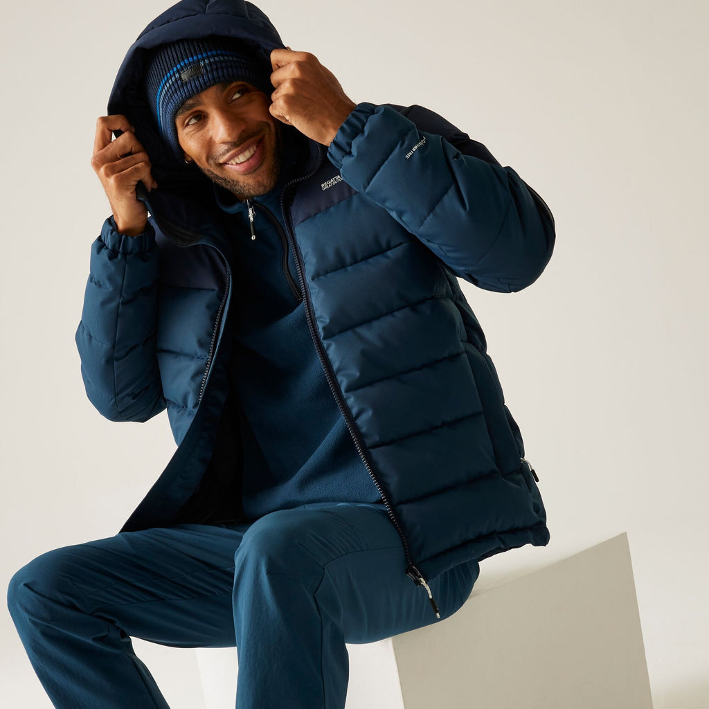 The Regatta Aldthorn Padded Jacket in Navy Blue combines refined style with functional design, making it an essential for cold-weather days. Filled with premium synthetic down insulation, it offers exceptional lightweight warmth while maintaining breathability. The jacket features a durable water-repellent finish and a tailored grown-on hood with adjusters for enhanced protection. Practical details such as elasticated cuffs, an adjustable hem, zipped lower pockets, and an internal security pocket ensure convenience and versatility, perfect for outdoor activities or sophisticated urban wear.