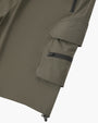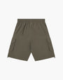 Matte Olive Green Technical Cargo Shorts made from a durable all purpose utility fabric. Side entry zip pockets with side leg cargo pockets, elasticated waistband and adjustable hem cuff detailing